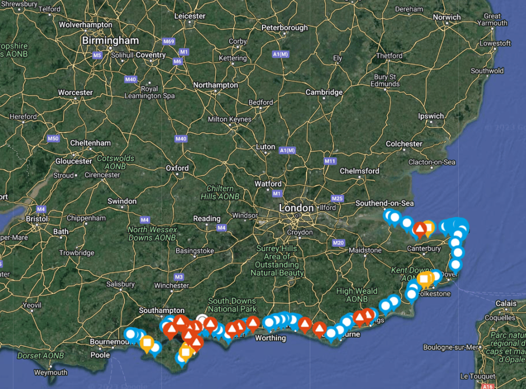 The map below overlays Thames Water’s newly published ‘real-time’ map of their sewage discharges with the similar Southern Water ‘Beachbuoy’ map of discharges affecting the bathing beaches in their area.