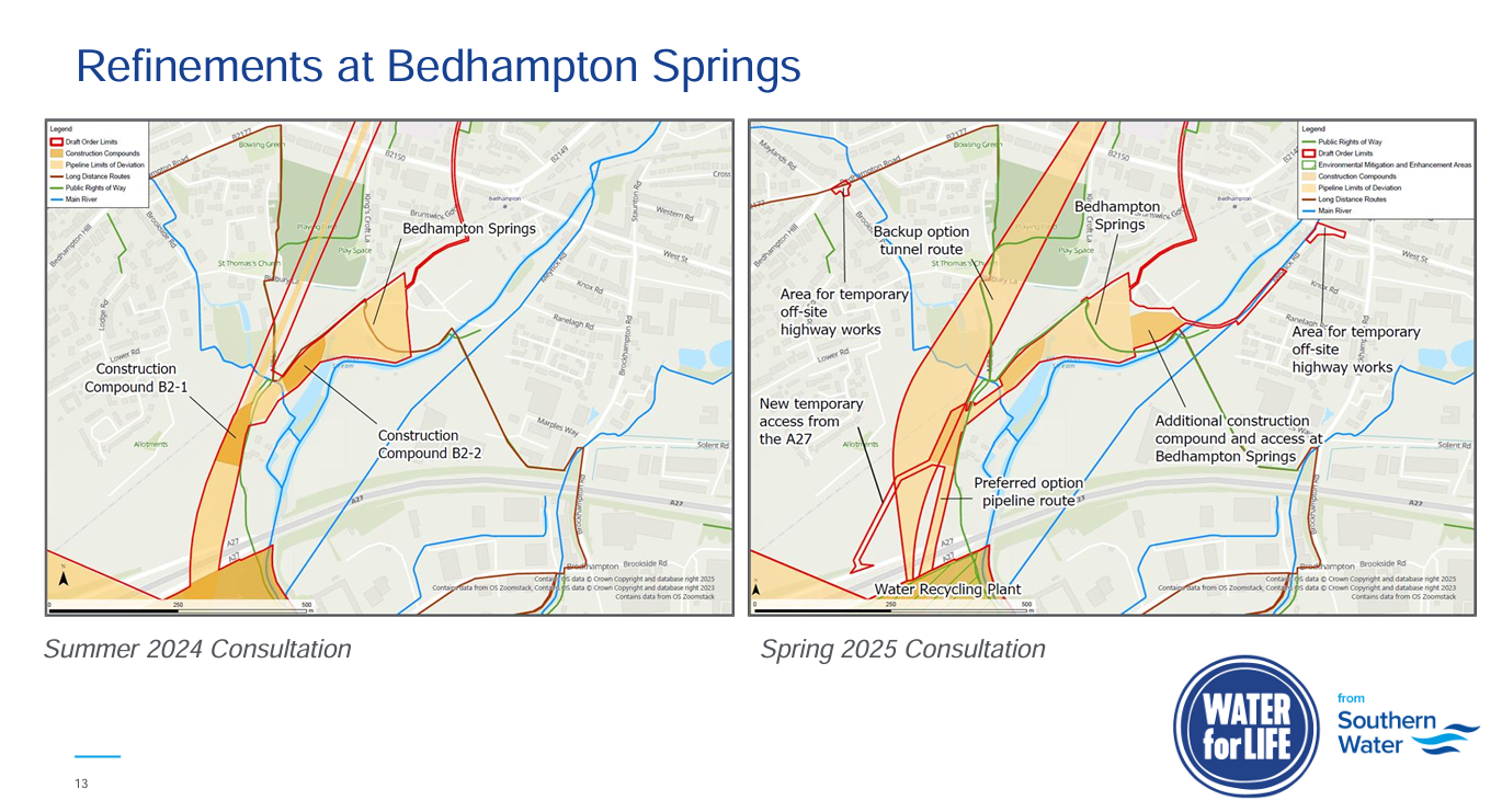 - Order limits (project boundary) have been extended for parts of the scheme at Bedhampton Springs site, to include an additional access road and an additional construction compound. The Order Limit is the maximum expected extent of the land the Project would be delivered within. It includes the area required for above ground plant, pipelines, access routes and temporary work areas required for construction. See red lines on map, above.