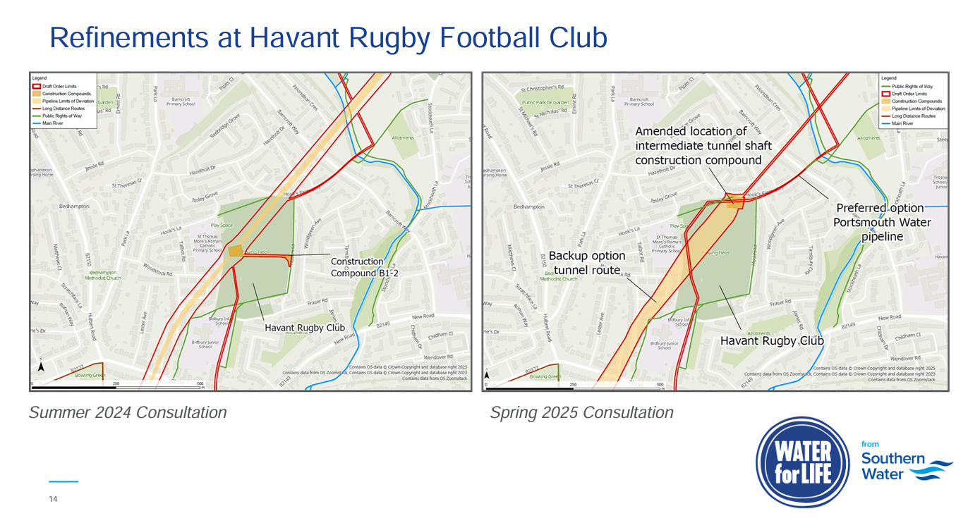 5 – Changes to the shaft and compound location at the Havant Rugby Club are shown on the map below. These are an improvement but there will still be a significant impact on the Rugby Club, St. Thomas Moore school and the local community, with loss of public open space and disturbance for a significant time period.
