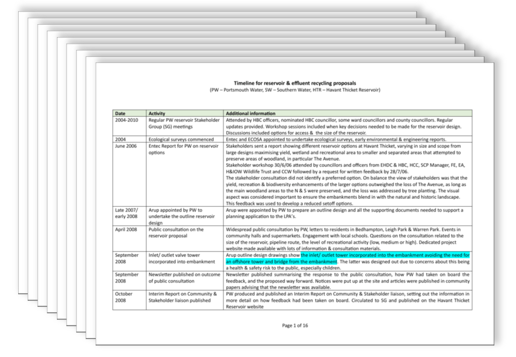 The document referenced below contains a detailed 12 page timeline together with a supporting appendix, which tells the bigger story. Southern Water’s interest in Portsmouth Water’s reservoir has fluctuated over that period and you are encouraged to open the document – by clicking the image below – and read the detail and the notes it contains. You might find some of the content surprising.