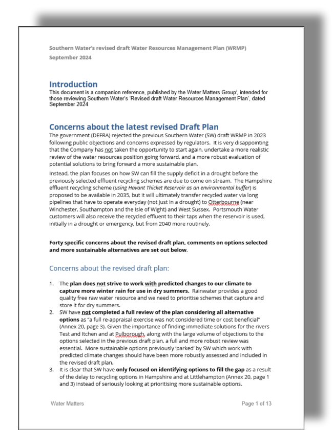 The content of this page is intended to give individuals and groups an overview of 40 key concerns regarding Southern Water’s revised draft WRMP which is available for consultation until 4 December 2024. The points have been highlighted by a concerned retired water industry expert within the ‘Water Matters’ group and will help you to pin-point key information of concern within the vast volume of consultation reports and appendices.
